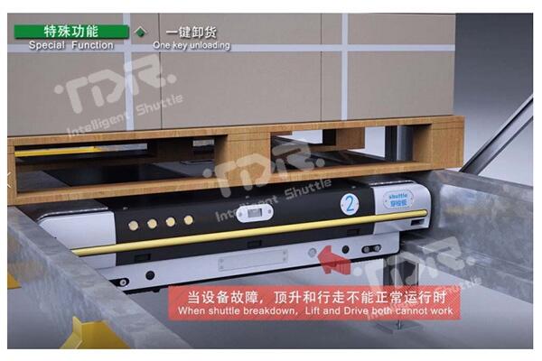 當(dāng)使用救援車救援穿梭板時(shí),如穿梭板處于重載狀態(tài),則很難將穿梭板帶貨物一起拖出,通過此功能,一鍵即可將托盤放置到軌道上,直接將穿梭板拉出即可。